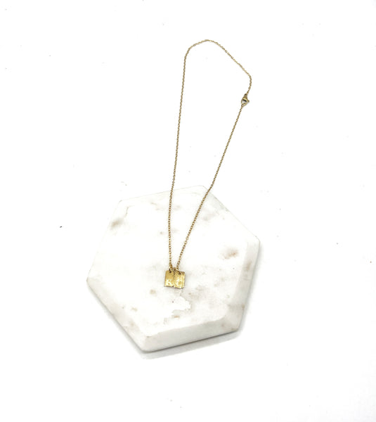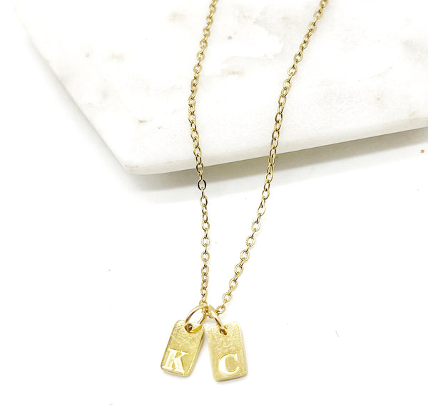 Made with stainless steel chain, charms and jump rings, the necklace measures 17 inches long. Available in a silver version as well.